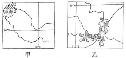 下图为世界两大湖泊示意图, 图中甲、乙两湖泊的湖泊面积 自上世纪 60 年代以来都呈缩 小趋势。