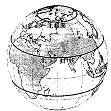 【小题2】此时北半球为夏季,M地月均温在0℃以上,A错;M为地中海地区,为地中海气候,夏季炎热干燥,此时为枯水期,B错;E位于亚欧大陆东部,夏季风从海洋吹向陆地,盛行东南风,C正确;F为低压,D错。