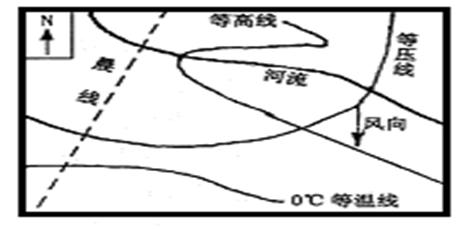 本题解析:本题考查等值线的综合判断。根据风向与等压线的关系,风向向右偏,判断该地区位于北半球,根据晨线的分布特征:越往北昼越短,判断为北半球的冬季,该地区昼短夜长;图示河流的温度在0°C以下,则河流有冰期,但河流自较高纬向较低纬流,判断河流无凌汛。故C项正确。