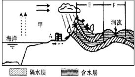 (1)图示甲处的水循环联系陆地和海洋,故属于海陆间循环;E处中间岩层向下凹,判断为向斜,F处中间岩层向上拱起,判断为背斜;