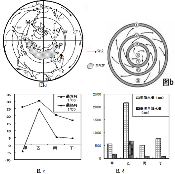 (8)甲、乙、丙、丁四地与图a中①地气候类型一致的是 ,该气候类型的形成原因是 ;与②地气候类型一致的是 ,该气候类型的特征是 。