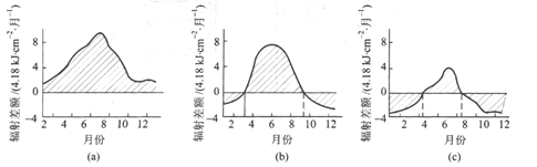 本题考查对地理图表的判读和理解,提取有效信息。辐射差额是指在某一段时间内物体能量收支的差值,辐射差额为正值,说明该地太阳辐射能丰富。三个地区比较a地太阳辐射差额常年为正值,所以a地纬度最低,c地负值月份较多,说明获得的太阳辐射少,纬度最高,所以a、b、c三地纬度由高到低的排列顺序为cba。所以本题选择C选项。