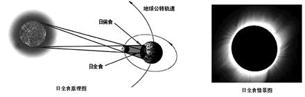 2、单选题 2009年7月22日,我国长江流域出现了五百年一遇的日全食天象,该图为日全食的原理图和情景图,回答下列问题。