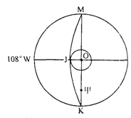 5、单选题 下图是以极点为中心的投影图,其中MJK为晨昏线的一部分,此时我国漠河(约122°E)地区夜幕刚刚降临,据此完成下列各题