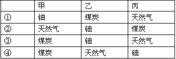 本题考查世界自然资源的分布。中国和美国的储藏量丰富,产量约占世界60%是煤炭;俄罗斯和美国的产量占世界40%,该种资源燃烧效率高,预计需求量会大增的是天然气;丙为核电站的原料铀。所以本题选择D选项。