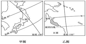 (1)根据比例尺的相关知识,当实际距离相等时,图上距离和比例尺成正比,图上距离大的,比例尺就大;从两图经线上看,相同的实地距离,图上距离甲图大于乙图,甲图比例尺大。