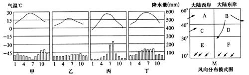 (2)甲、乙、丙、丁四种气候类型在M图中相应的位置分别是?、 、 、 。