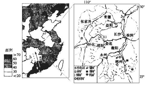 材料二:湖南省被誉为“有色金属之乡”,已探明储量的有色金属有37种,其中锑的储量居世界首位,钨、铋、铅锌的储量也很丰富。湖南省有色金属冶炼工业基础较好,株洲有规模大、技术先进的铅锌冶炼厂。上面的右图为湖南省有色金属工业分布示意图。下表为湖南部分地区有色金属储量分布表。