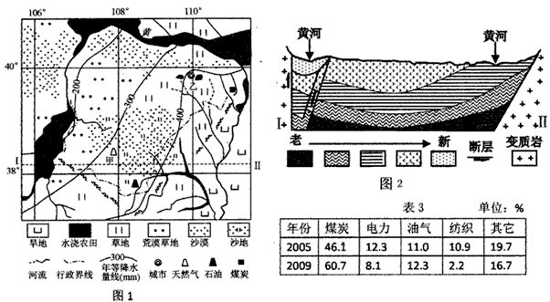 2、综合题 图1为我国某区域示意图,图2为1中ⅠⅡ两点连线的地质剖面示意图,表3为乙市工业产值构成表。完成下列问题。