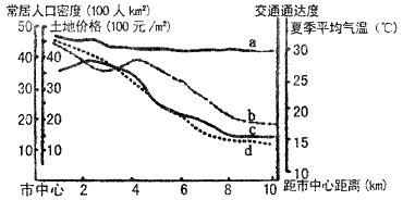 4、单选题 下图为我国某特大城市人口密度、土地价格、交通通达度,夏季平均气温变化图,读图回答1—3题。