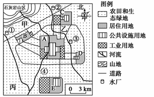 1、单选题 读下面某城市用地示意图(下左图) (A为主城区,兼有B、C卫星城)和该市常住人口年龄比例图(下右图),回答下列问题。
