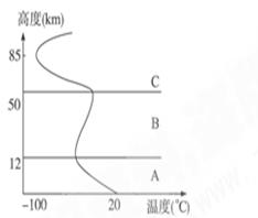 本题解析:(1)根据对流层的厚度约12KM,判断该地区位于中纬度地区,对流层的厚度在高低纬度的分布是不均的。(2)A层为近地面,由于近地面大气对太阳辐射的吸收作用弱,而对地面长波辐射具有很强的吸收能力,故判断对流层的直接热源是地面。由于该层大气的气温分布上冷下热,且几乎集中了全部的水汽和固体杂质,故天气现象复杂多变。(3)直接根据图示判断50~85千米高度,气温随高度升高而递减,则气温上冷下热,故大气运动应以对流运动为主。