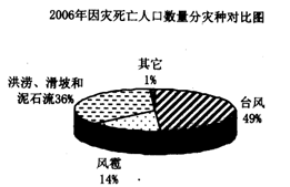 本题考查地理图表的判读能力。根据图示我国灾害死亡人数存在波动;2006年我国灾害死亡人数较多的为台风灾害和洪涝、滑坡、泥石流等。我国台风主要影响东南沿海地区,洪涝主要影响长江流域和西南地区;2006年因灾死亡人数比2005年死亡人数高出27.5%。所以本题选择B选项。