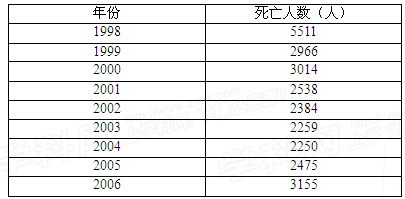 3、单选题 重大灾害事件是造成人员严重伤亡的主要原因,读“我国1998年以来历年同期灾害死亡人数对比表”和“我国2006年因灾死亡人口数量分灾种对比图”,回答第7题。