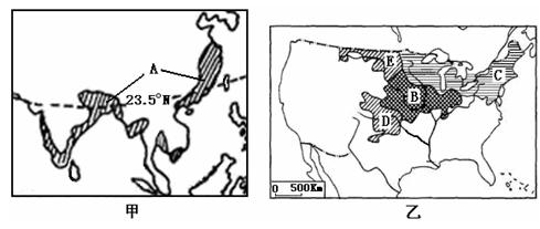 1、综合题 (9分)下图甲乙两区域图中的阴影代表三种不同的农业地域类型,读图回答下列问题:
