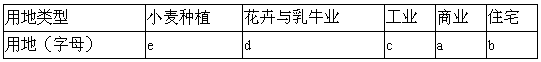 (1)上图中a—e表示小麦种植、花卉与乳牛业、工业、商业、住宅地租水平线,请将字母填入下表相应