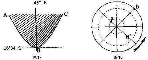 4、综合题 图17中弧线ABC为晨昏线的一段,阴影部分为黑夜。图18为地球极地俯视图。读图回答下列问题。(11分)