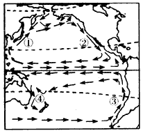 (2)图中为暖流的洋流的数字代号是________,寒流的数字代号是________。从一般规律来看,南、北半球中低纬的大 洋东岸为________,大洋西岸为________。(7分)
