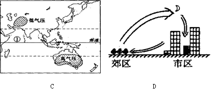 点评:本题难度不大,学生只要仔细读图,结合热力环流对应知识即可作答;解题的关键是掌握热力环流形成的基本原理。并注意从材料中提取有效信息,结合天气状况判断大气热力作用的效果。