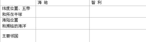 小题1:比较海地和智利两国的地理位置特点,完成以下表格: