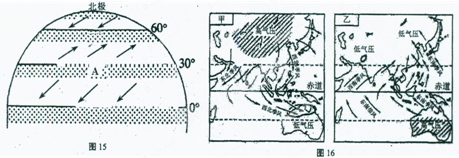 (1)图15中A气压带名称为         ,当全球气压带和风带如图15 所示位置时,亚洲季风环流为图16中         (甲或乙)所示。