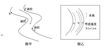 4、单选题 风水学是中国古文化一门源远流长的学问。其积极意义是引导民众在山河大地之间选择一处适合生存的环境。古代将河流的凸岸称为讷位。读某河流分布图(图甲)及弯道水速示意图(图乙),回答下列小题。