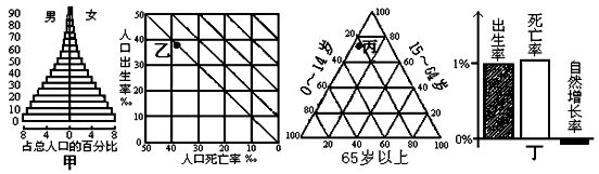 1、单选题 下图为“甲、乙、丙、丁四地的近年人口统计图”,回答下题。