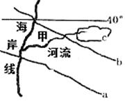 4、单选题 下图中的40°线为纬线,a、b、c为等温线,并且甲地常年受西风带的控制。读图回答下列各题。