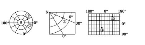 4、单选题 读下面三幅经纬网示意图,①~⑤各地,地理坐标相同的是 ( )