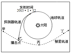 5、单选题 太平洋时间2005年7月3日22时52分(北京时间2005年7月4日13时52分),美国宇航局(NASA)重达372公斤的铜质撞击器,在距地球约1.3亿公里处与坦普尔1号彗星成功相撞,完成了人造航天器和彗星的“第一次亲密接触”。图中反映的天体系统是( )
