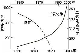 本题解析:要注意上下两个横坐标,二氧化碳是工业革命后开始大量增加的,横坐标应是下面的;导致臭氧减少的物质是20世纪才出现的,横坐标应是上面的。