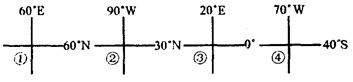 1、单选题 如图为世界四个地点的坐标,据此分析并回答下面各题。
