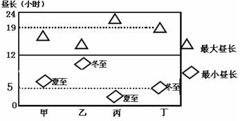 5、单选题 下图为甲乙丙丁四地二至日昼长示意图,读图回答下列问题。
