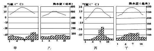 (2)甲为地中海气候,分布在南北纬30~40度的大陆西岸,位于C处。乙是温带海洋性气候,分布在南北纬40~60度的大陆西岸,A处。丙为温带季风气候,布布在35~55度的大陆东岸,B处。丁是亚热带季风气候,分布在25~35度的大陆东岸,D处。