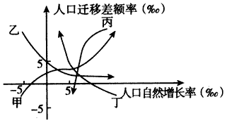 1、单选题 下图表示1978~2008年期间,甲、乙、丙、丁四个城市人口变动统计情况(人口迁移差额率为人口迁入与迁出的差额占总人口的比重)。读图回答1—2题。