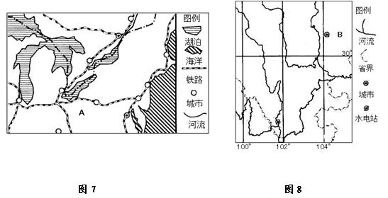 材料一 纽约所在的北美局部地区示意图(图7)和四川省局部地区图(图8)