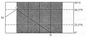 4、单选题 在下面经纬网局部图中,MON为晨昏线,阴影与空白区域分属不同的日期。 读图回答下列各题。