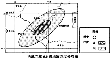 2、综合题 ? 2008年10月6日16时30分,在西藏拉萨市当雄县境内发生6.6级地震,西藏拉萨、日喀则、云南等地有明显震感。截至10月10日,地震已造成拉萨市61231人受灾,死亡10人。而同年5月12日14时28分,四川省阿坝州汶川县发生里氏8级大地震,造成四川、甘肃、陕西、重庆、云南、山西、贵州、湖北8省市不同程度受灾。截至29日12时,四川汶川地震已造成69197人遇难,374177人受伤,失踪18404人。结合下图,完成下列各题。