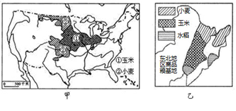 1.甲、乙两幅图中的农业区所属的农业地域类型是2.影响两个地区小麦种植的共同的有利自然条件是