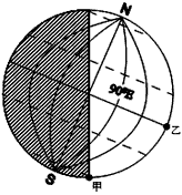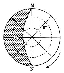 5、综合题 下图为太阳光照图,斜线(阴影)部分表示夜半球,空白部分表示昼半球,读后完成下列要求。