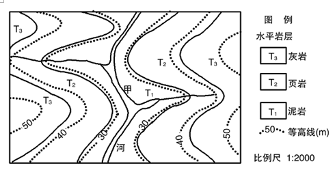 小题1:读图,根据图例可知,T1 、T2、T3 都是沉积岩,沉积岩层下面的是老岩层,根据图中的海拔高度判断,T1海拔最低,在下面形成的早,T2居中,T3形成最晚在最上面,所以A对。B、C、D错。