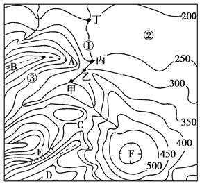 1.下列有关图中等高线表示的基本地形的叙述中,正确的是2.图中E处陡崖的相对高度可能是