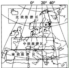 3、综合题 欧洲拥有丰富的旅游资源,是世界上最活跃的旅游地区之一,按自然旅游风光大致可分为三大旅游区,即北欧、中欧和南欧旅游区。结合下图,回答问题。