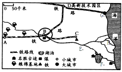 (2)B、C两城市之间的铁路线建成后,最有利于促进B城发展的工业部门是__________,其主要原因是?。(6分)