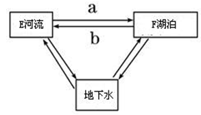 材料二:材料一图中E河流、F湖泊、地下水三种陆地水体相互转化关系示意图。