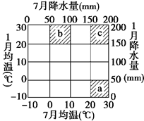 【小题2】根据气候特征判断“以温定带,以水定型”可知,b高温在1月,位于南半球;最低温度在0℃以上,雨热同期,是亚热带季风性湿润气候,位于大陆的东岸。选择C项。