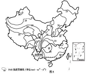 4、单选题 能被植物光合作用利用的太阳辐射,称为光合有效辐射(PAR)。图5示意1961~ 2007年我国年平均PAR强度的空间分布。据此完成下列问题。
