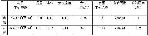 3、单选题 ? 在2010年10月21日召开的第三届中国空间技术论坛上,中国空间技术研究院专家介绍说,中国以“嫦娥一号”卫星平台为基础,综合月球探测技术,已提出自主火星环绕探测的技术方案。读下表资料,回答1—2题。