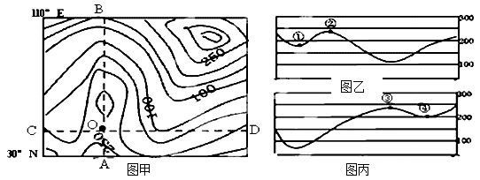 【小题1】读图,图中等高距是50米,AB线最高处海拔大于250米,图乙中最高点海拔小于250米,A错。③可能在图甲中剖面线AB上山顶的两侧,不一定在CD上,B错。②位于剖面线CD的最高点,根据海拔比较,④海拔接近图甲中AB线与CD线的交点O点,C对。站在③点可能看到①点,二者间没有阻挡,D错。