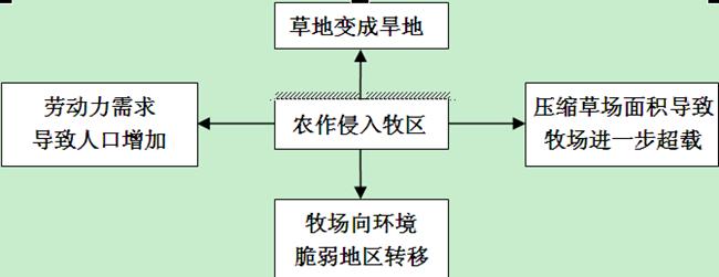 (4)人口增长导致粮食需求增加,农作侵入牧区,过度开垦使得草地变成旱地;草场面积缩小,导致牧场进一步超载,并向环境脆弱地区转移,荒漠化进一步加剧;农作区需要较多劳动力,又会造成新一轮的过度垦牧。